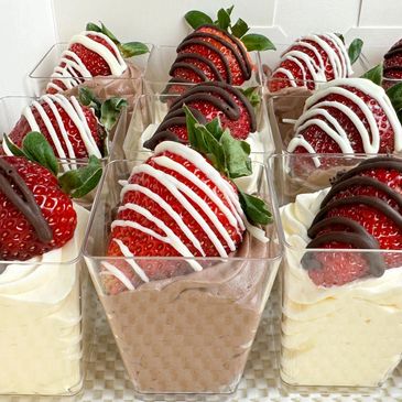 Choice of white chocolate or chocolate mousse topped with a fresh chocolate decorated strawberry.